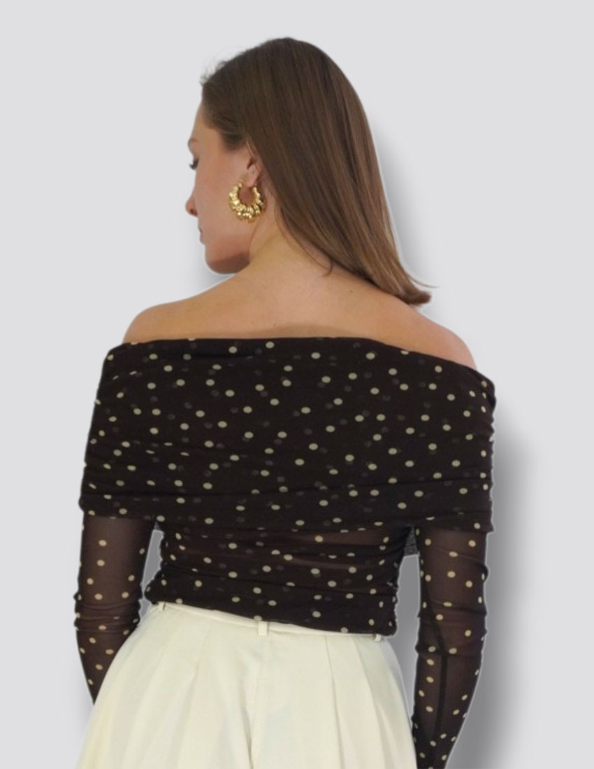 Blusa escote bardot, hombros descubiertos en mesh cafe polka dots beige