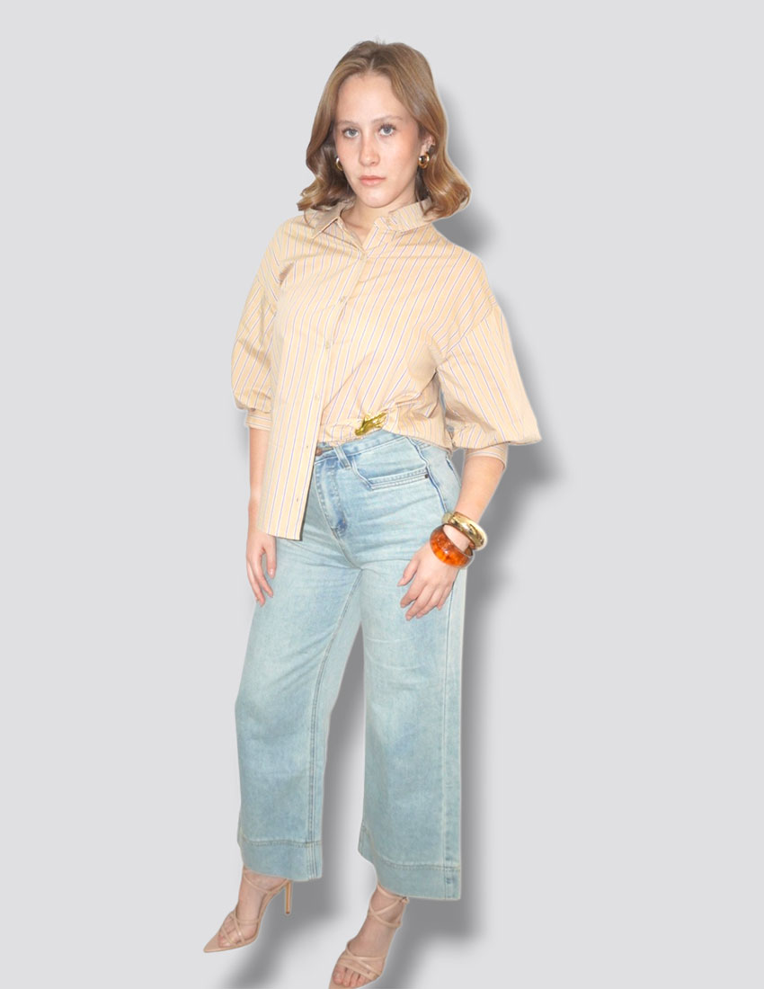 Camisa, color mantequilla rayas azules, manga 3/4 abullonada cantidad