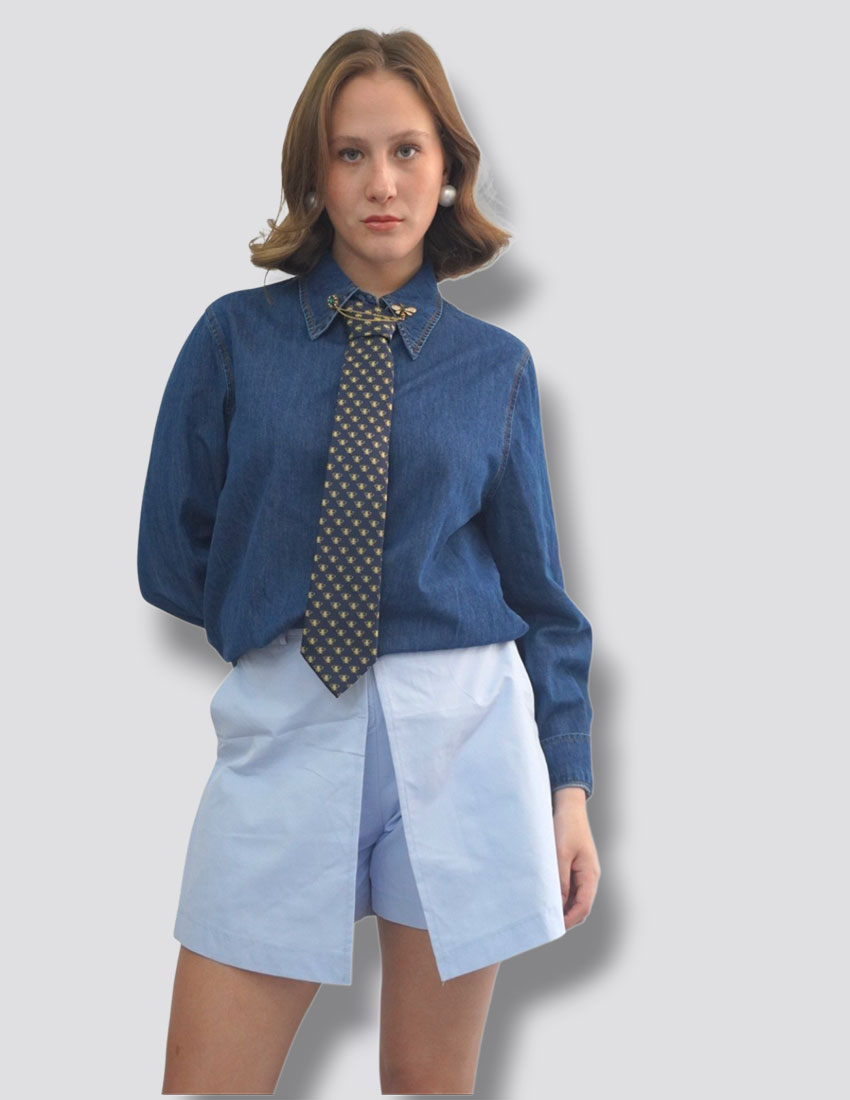 Camisa denim indigo, manga larga, botones ocultos cantidad