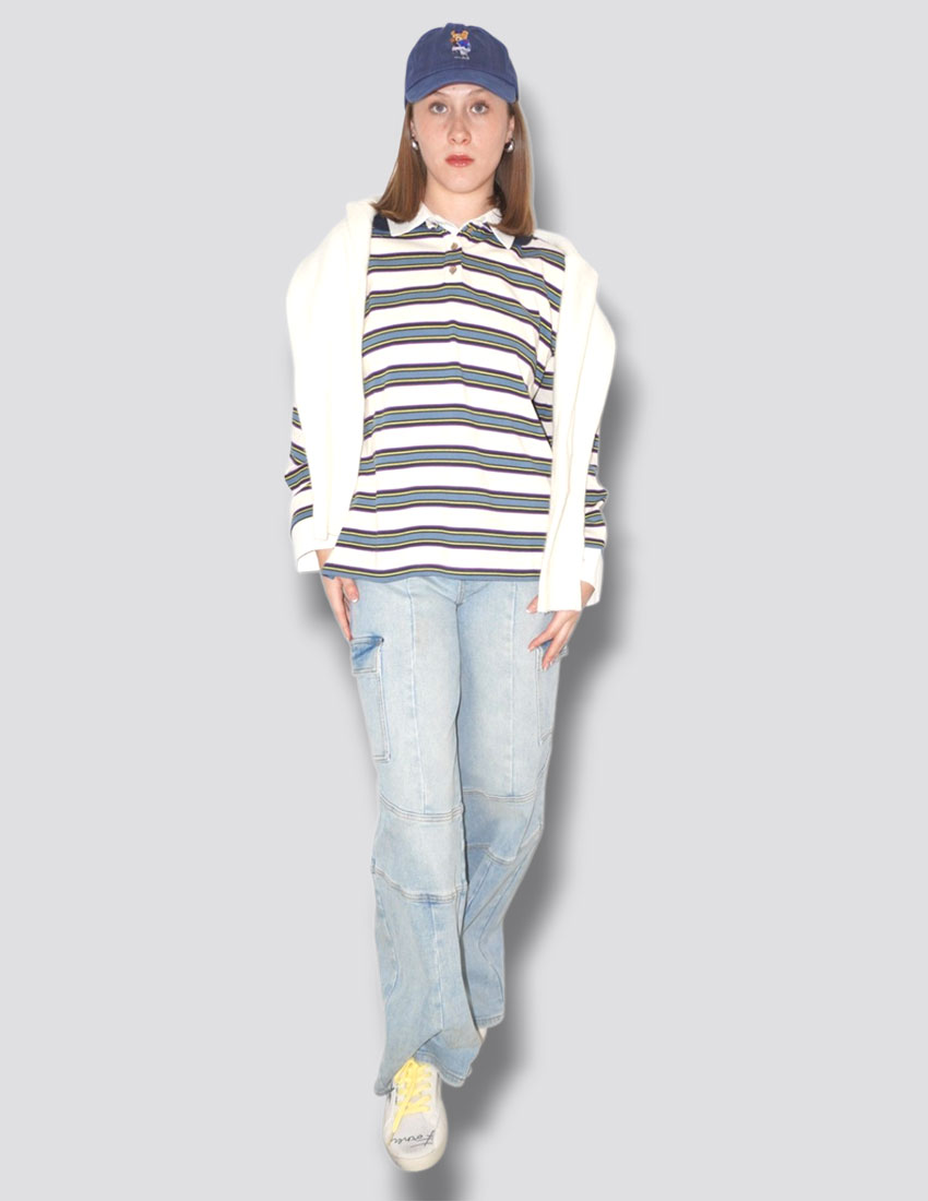 Playera tipo polo, manga larga blanca con rayas