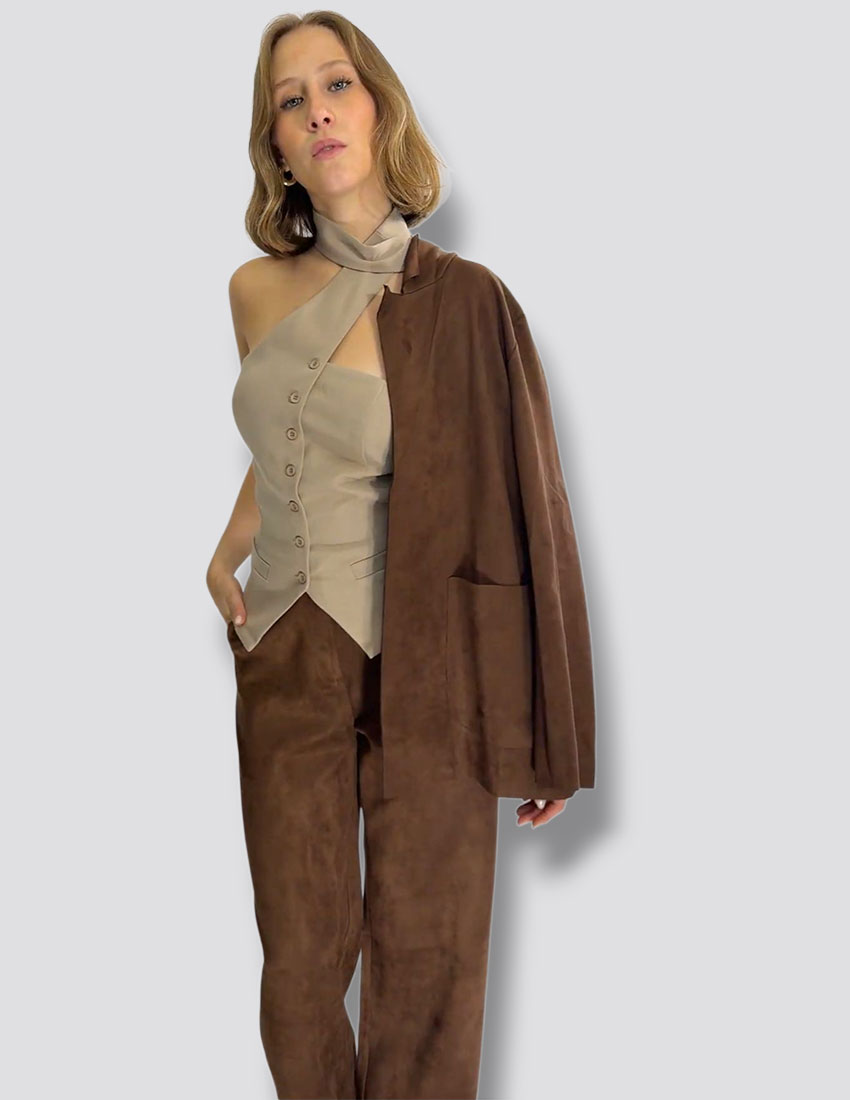 Set blazer abierto y pantalon corte recto en suede tabaco