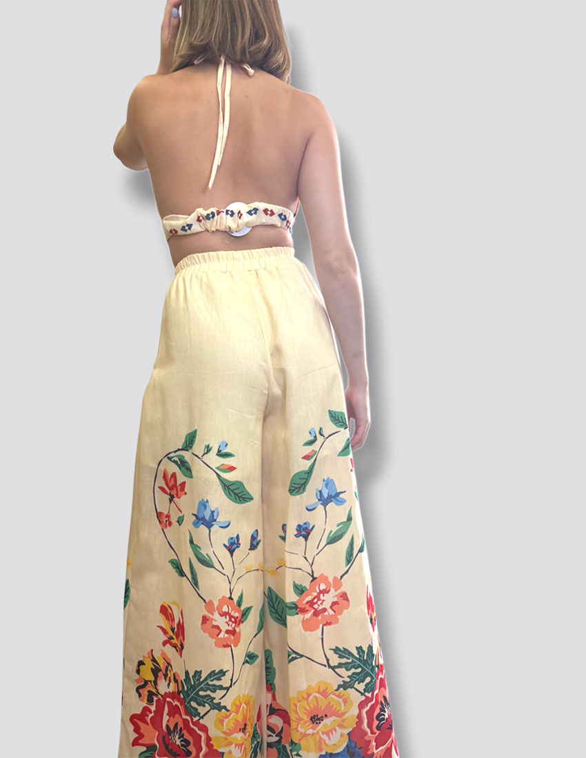Set crop top y pantalon pata de elefante amarillo con print flores colores