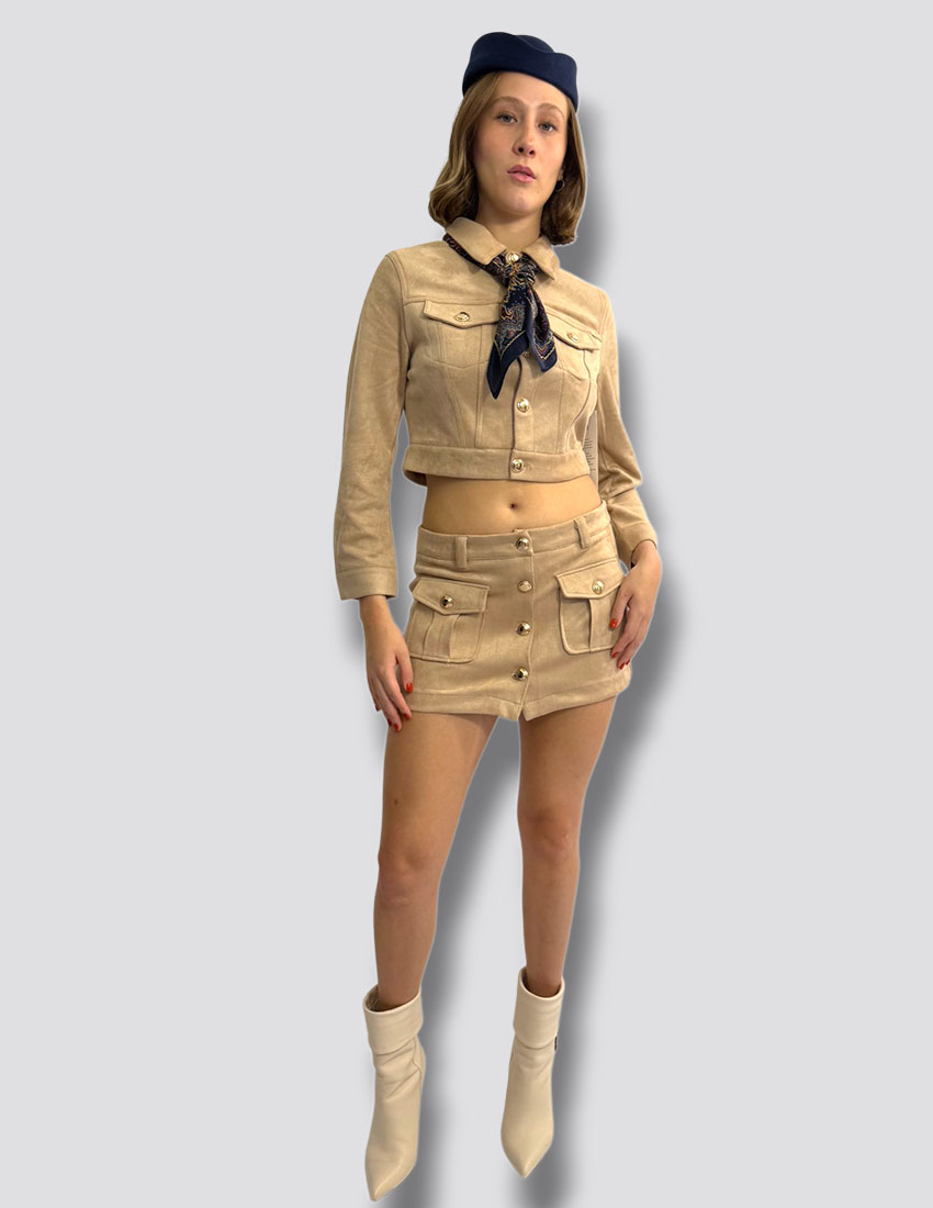 Set en suede color beige, minifalda y chamarra cropped