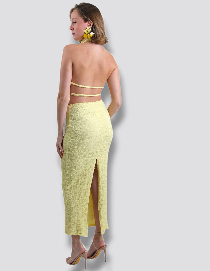 Set top halter y falda lapiz, textura en tela amarillo mantequilla