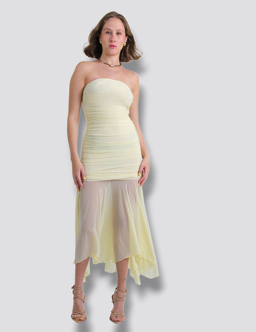Vestido drapeado en dorso, tela mesh amarillo mantequilla
